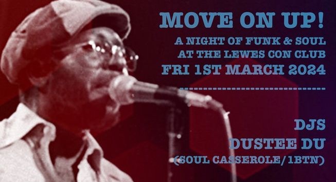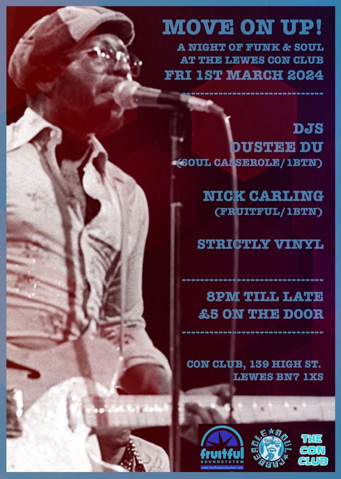 Move On Up! – a night of Funk & Soul at the Con Club. DJs Dustee Du (Soul Casserole/1BTN) and Nick Carling (Fruitful/1BTN) play a selction of Funk & Soul bangers all night long. Strictly vinyl. £5 on the door. Bar from 5:00pm. 8pm start. Bring your finest dancing shoes!