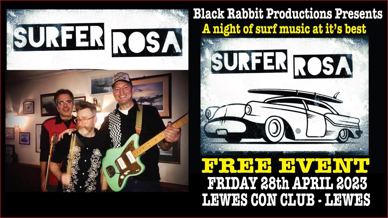 The coolest surf rock trio on the South Coast. Brighton’s Surfer Rosa ride the reverb drenched rollers of the twangiest tunes from 60s Southern California , carving some guitar driven TV and film theme tunes , and some surfed-up classics by Pixies , Stone Roses and Joy Division along the way.