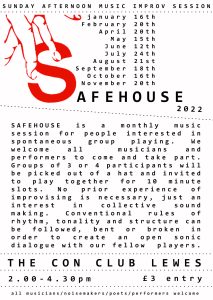 Musicians/performers/poets/noise makers interested in “free improvisation” come along to our Sunday afternoon (2.00-4.30pm), monthly session at the Con Club. £3 entry.