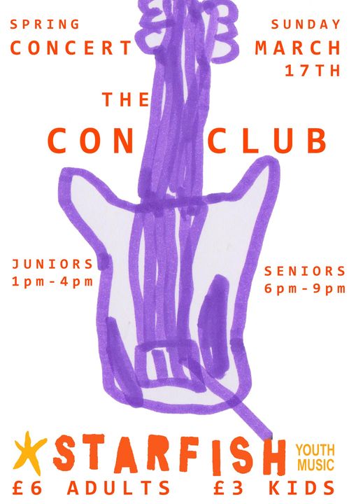 This Sunday at the Con Club – 2 gigs in one day! Young Starfish bands (9-13 years old) in the afternoon, Teen Starfish bands (14-16 years old) in the evening. Not just for friends and families – come along if you want to hear the sound of the future!!