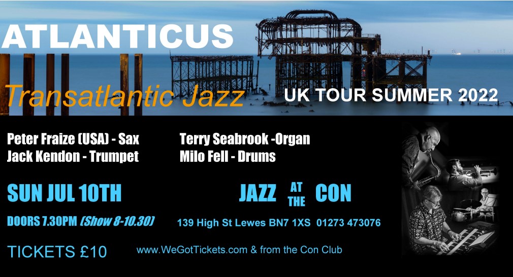 Atlanticus brings together 4 jazz musicians from each side of that big pond, the Atlantic Ocean. Saxophonist Peter Fraize (Washington DC) and keys man Terry Seabrook (Brighton) teamed up 5 years ago for a tour with trumpeter Jack Kendon and drummer Milo Fell. From the first gig their natural musical rapport sealed the bonds for what is now ATLANTICUS, delivering exciting performances culminating in a head-turning performance at the Love Supreme Festival. After a 25 date UK tour In 2018 they recorded an album, Blue Haven, which will be released for a new tour this summer (2022). Their music has a classic Hammond organ sound, is mostly original but includes the jazz classic ‘Moanin’ and Barry Manilow’s Mandy. It appeals to jazz and non-jazz afficaiandos. “A chance to hear jazz from the source”