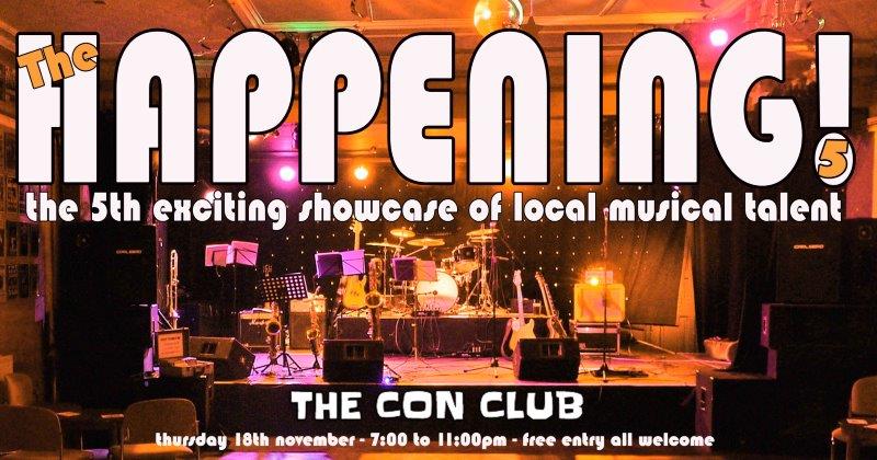 The Happening 5 – Multiple acts with live music from 7:30pm until 11:00pm. Bar from 5:00pm, doors and DJ from 7:00pm. Free entry and all welcome. The line up for H5 is: